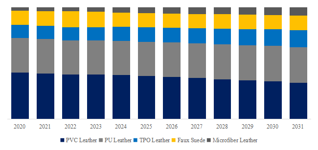 製品タイプ別では、現在PVCレザーが最大のセグメントであり、39.5%のシェアを占めている。
